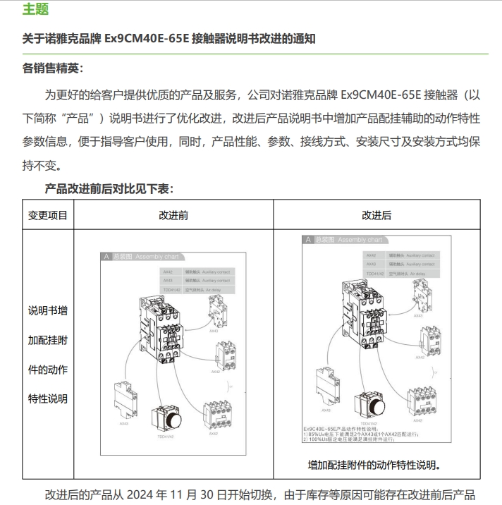 關(guān)于諾雅克品牌 Ex9CM40E-65E 接觸器說明書改進的通知