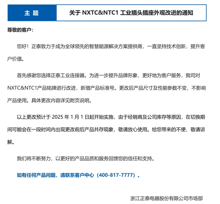 關(guān)于 NXTC&NTC1 工業(yè)插頭插座外觀改進的通知