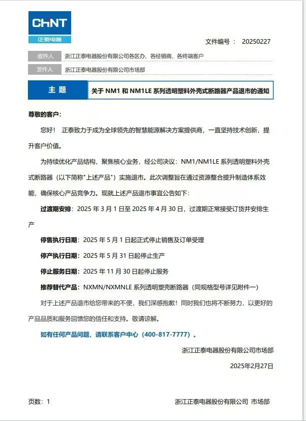 關(guān)于NM1和NM1LE系列透明塑料外殼式斷路器產(chǎn)品退市的通知