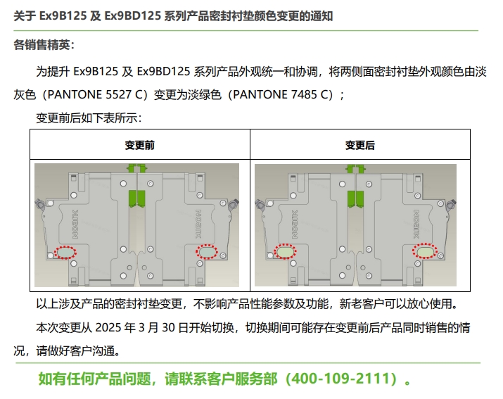 關(guān)于 Ex9B125 及 Ex9BD125 系列產(chǎn)品密封襯墊顏色變更的通知
