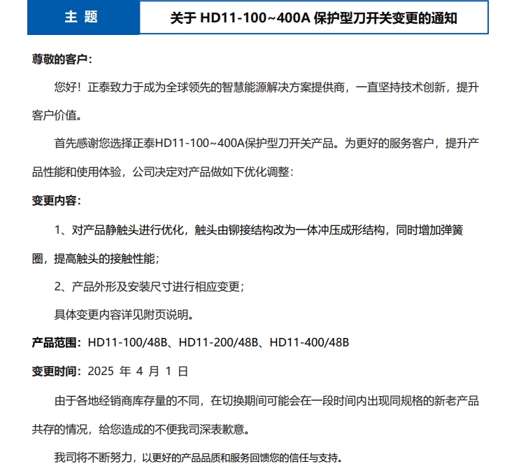 關(guān)于 HD11-100~400A 保護型刀開關(guān)變更的通知