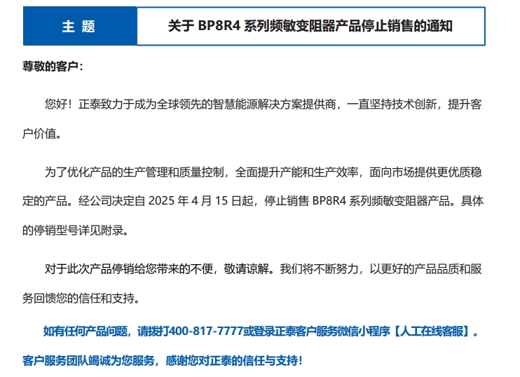 關(guān)于 BP8R4 系列頻敏變阻器產(chǎn)品停止銷售的通知