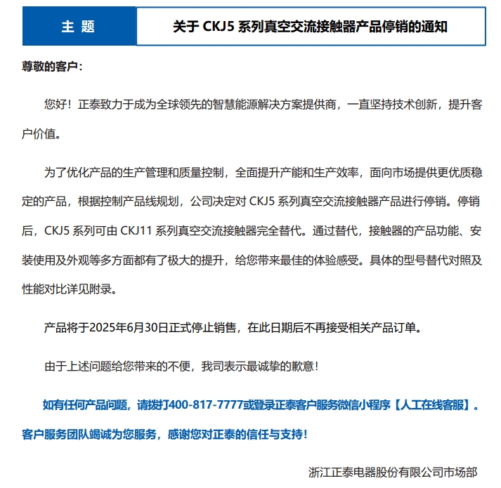 關(guān)于 CKJ5 系列真空交流接觸器產(chǎn)品停銷的通知
