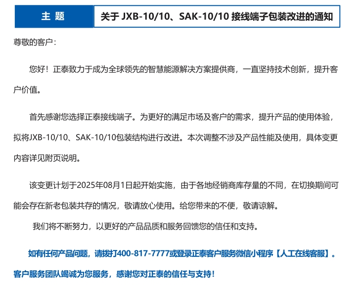 關(guān)于 JXB-10/10、SAK-10/10 接線端子包裝改進(jìn)的通知