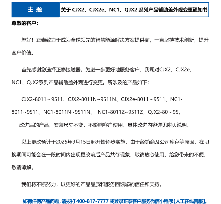 關(guān)于 CJX2、CJX2e、NC1、QJX2 系列產(chǎn)品輔助蓋外觀變更通知書