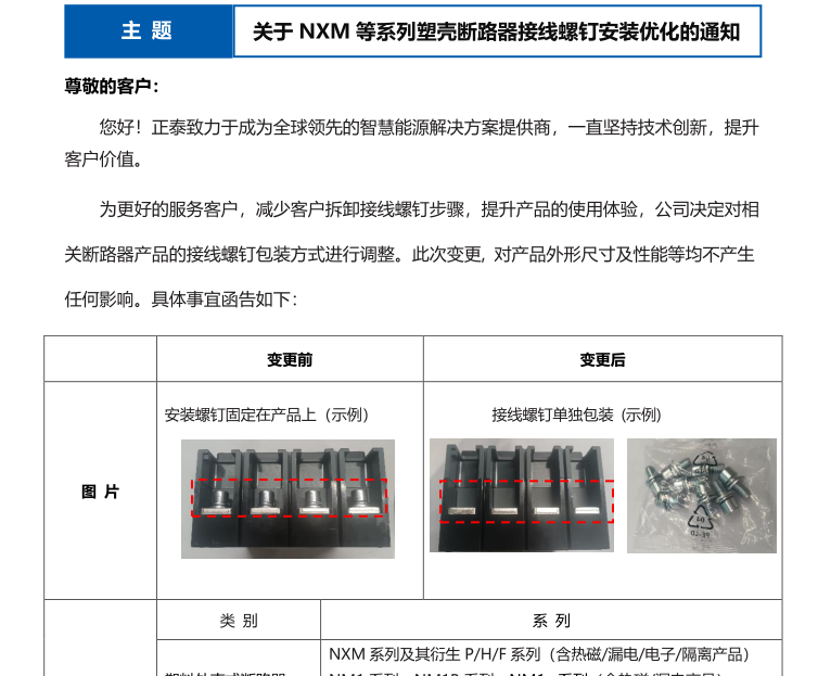 關(guān)于 NXM 等系列塑殼斷路器接線螺釘安裝優(yōu)化的通知