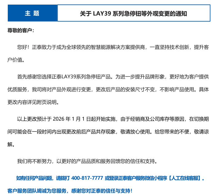 關(guān)于 LAY39 系列急停鈕等外觀變更的通知