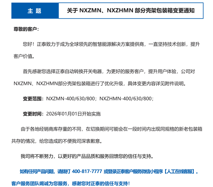 關于 NXZMN、NXZHMN 部分殼架包裝箱變更通知