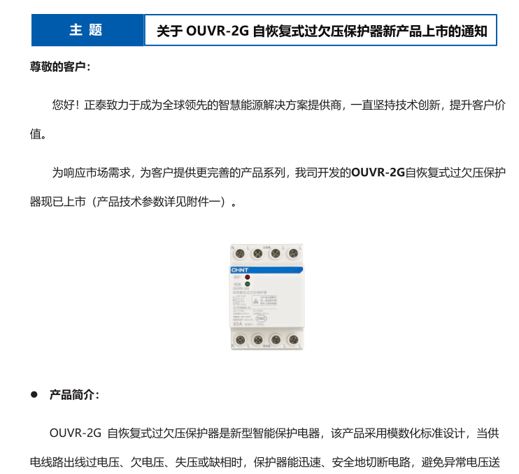 關(guān)于 OUVR-2G 自恢復(fù)式過欠壓保護(hù)器新產(chǎn)品上市的通知