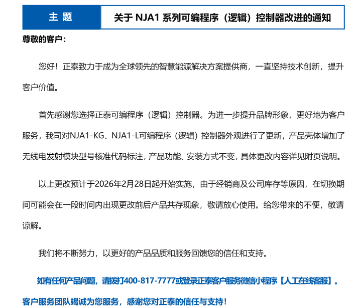 關(guān)于 NJA1 系列可編程序(邏輯)控制器改進(jìn)的通知