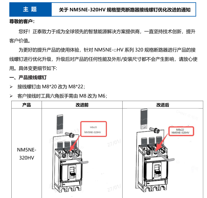 關于 NM5NE-320HV 規(guī)格塑殼斷路器接線螺釘優(yōu)化改進的通知