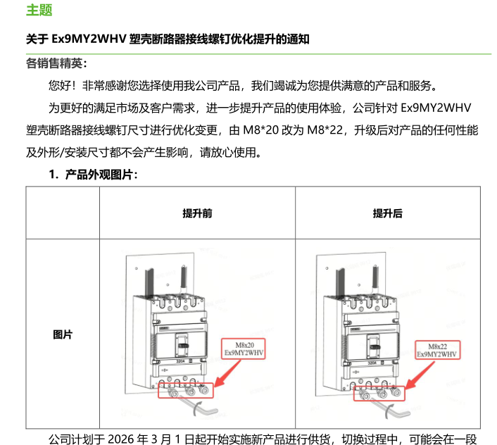關(guān)于 Ex9MY2WHV 塑殼斷路器接線螺釘優(yōu)化提升的通知