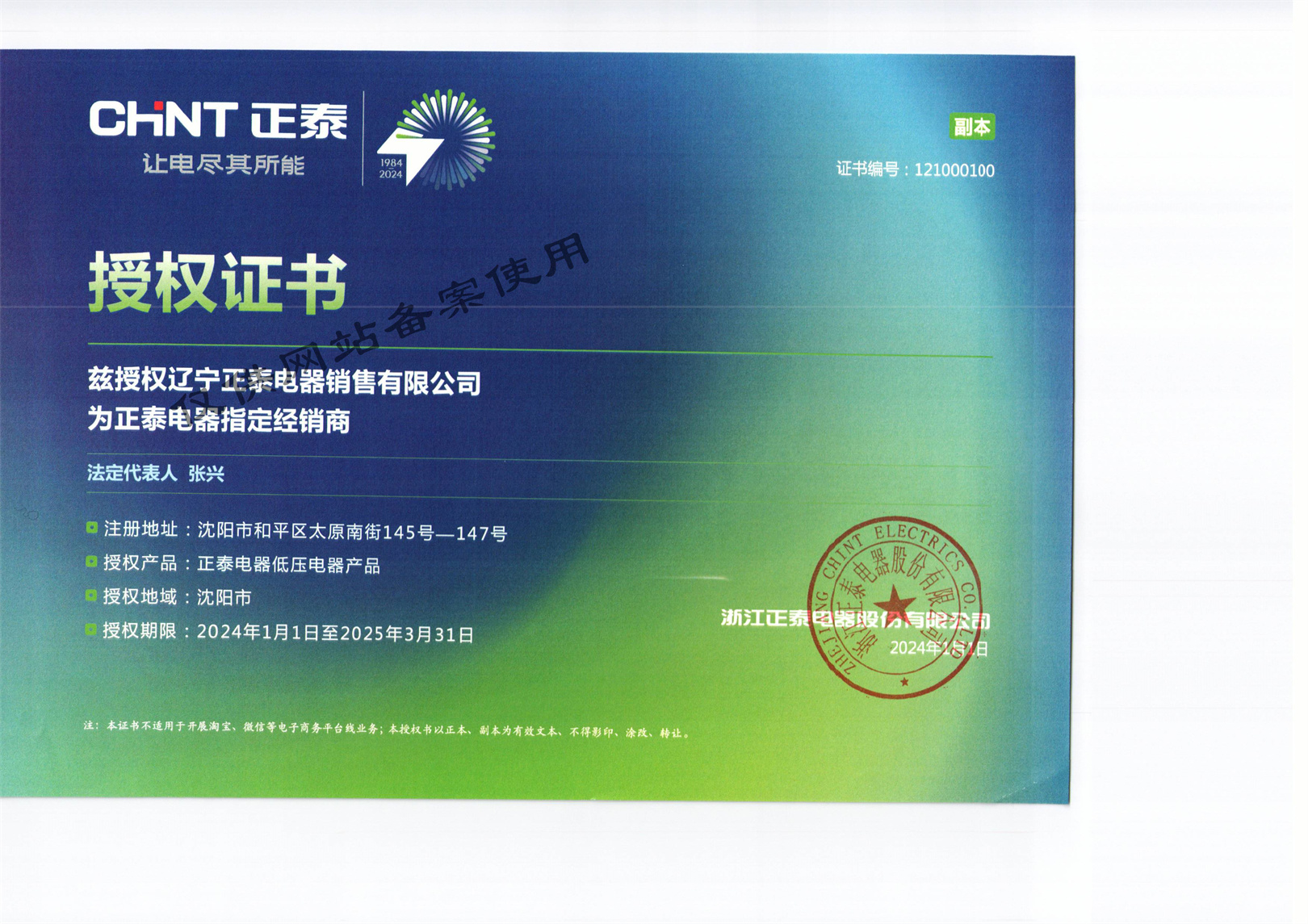 浙江正泰電器股份有限公司授權(quán)證書